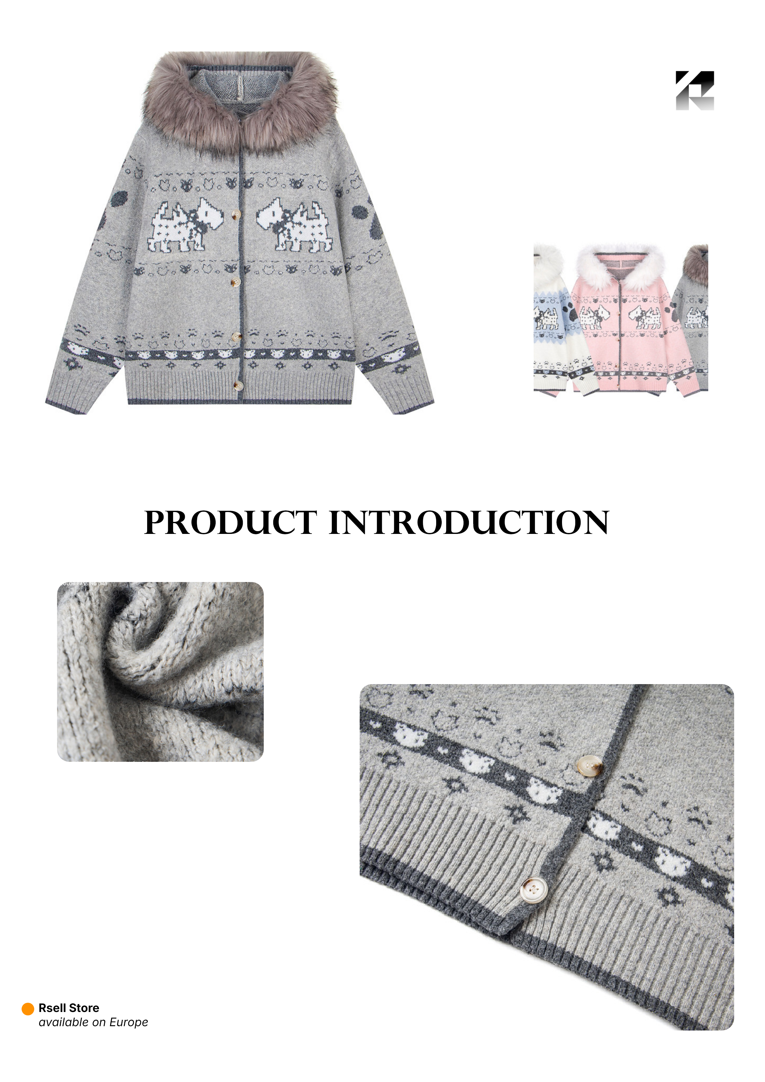 Crafted from a soft, thick knitted fabric, the sweater features a vintage Fair Isle jacquard pattern with playful dog motifs, adding character and retro charm. The faux fur–trimmed hood enhances warmth while elevating the overall streetwear aesthetic. A full-length button/zip cardigan design makes layering effortless, whether worn over tees, hoodies, or shirts.