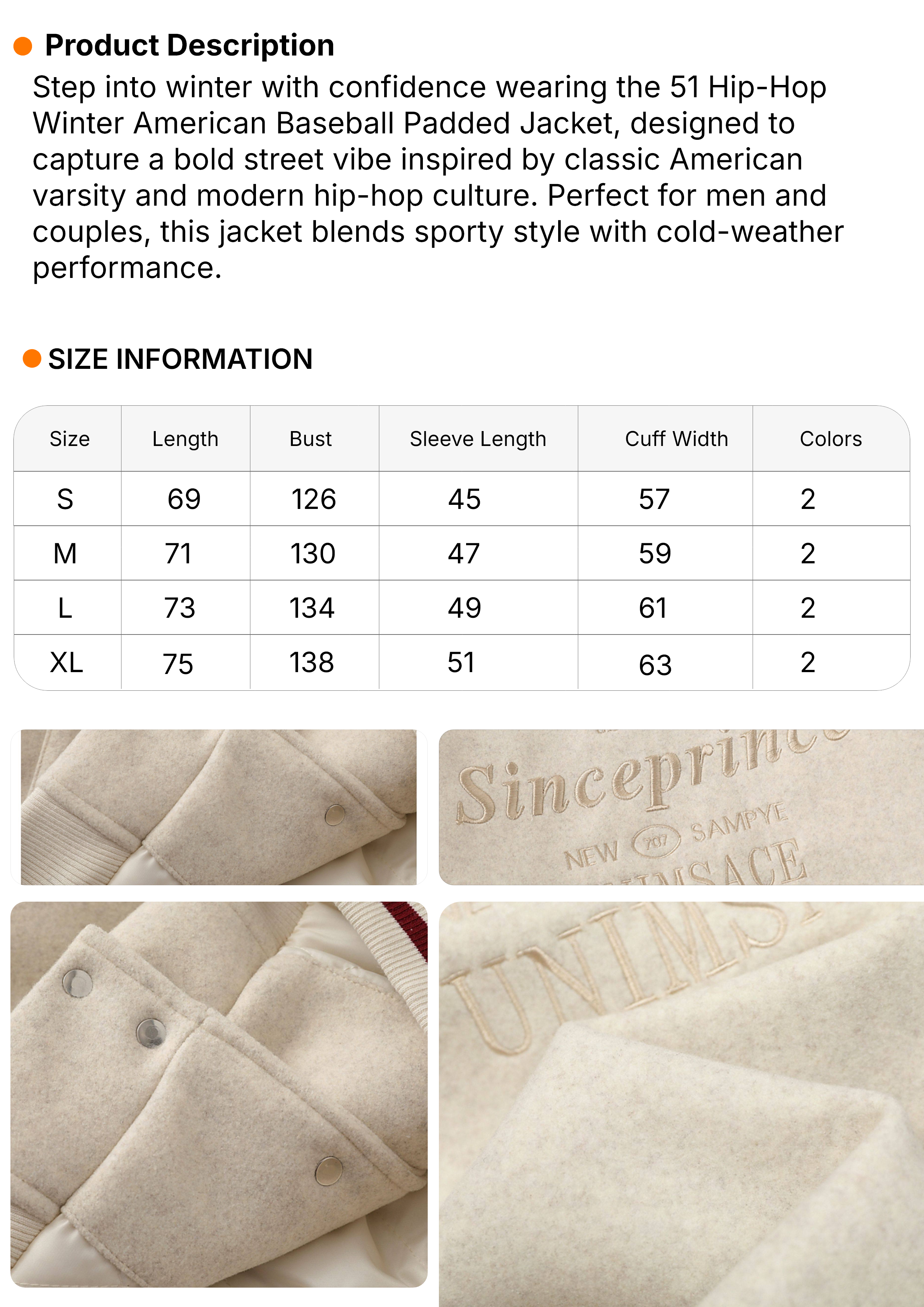 Step into winter with confidence wearing the 51 Hip-Hop Winter American Baseball Padded Jacket, designed to capture a bold street vibe inspired by classic American varsity and modern hip-hop culture. Perfect for men and couples, this jacket blends sporty style with cold-weather performance.
